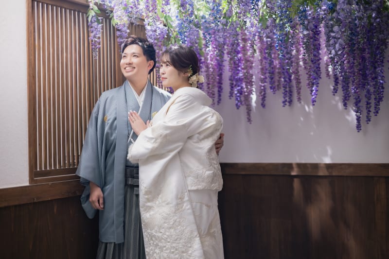 当店の屋内庭園スタジオから撮影スタート!白とエアリーブルーの紋付の組み合わせが爽やか!