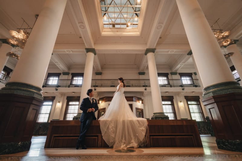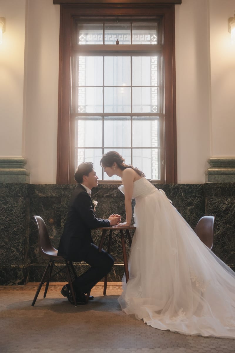 衣装をチェンジして、さや堂ホール撮影開始!落ち着いたお二人にはピッタリなロケ地です。