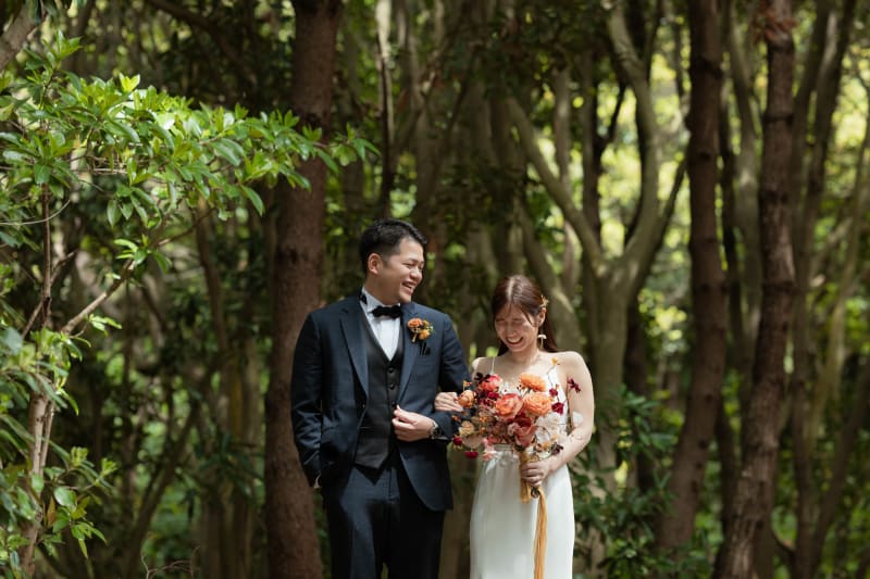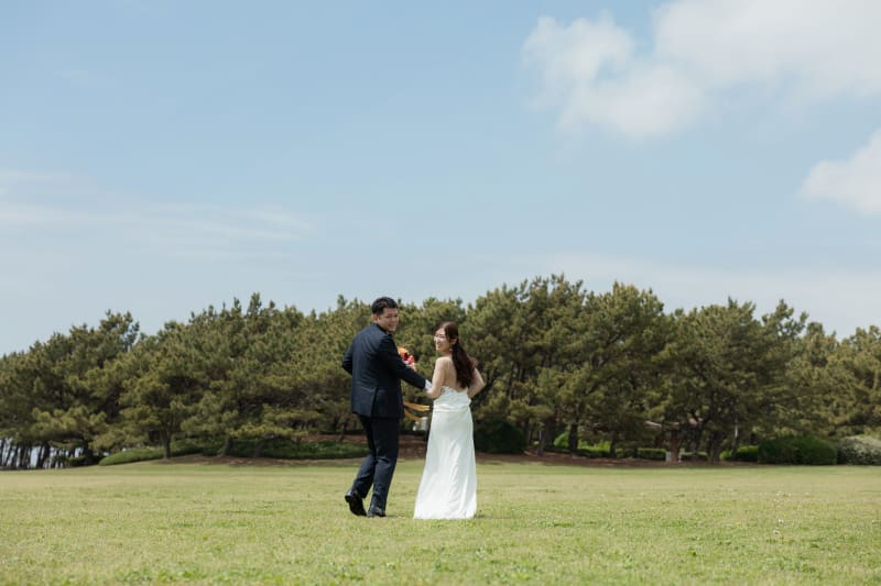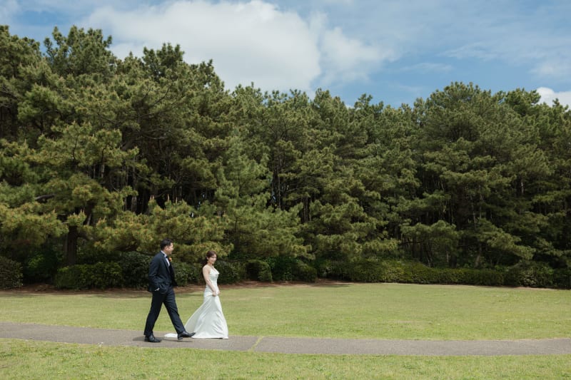 この日はとっても天気がよく青空も見えました! 広い芝生をおふたりで歩いているショット!