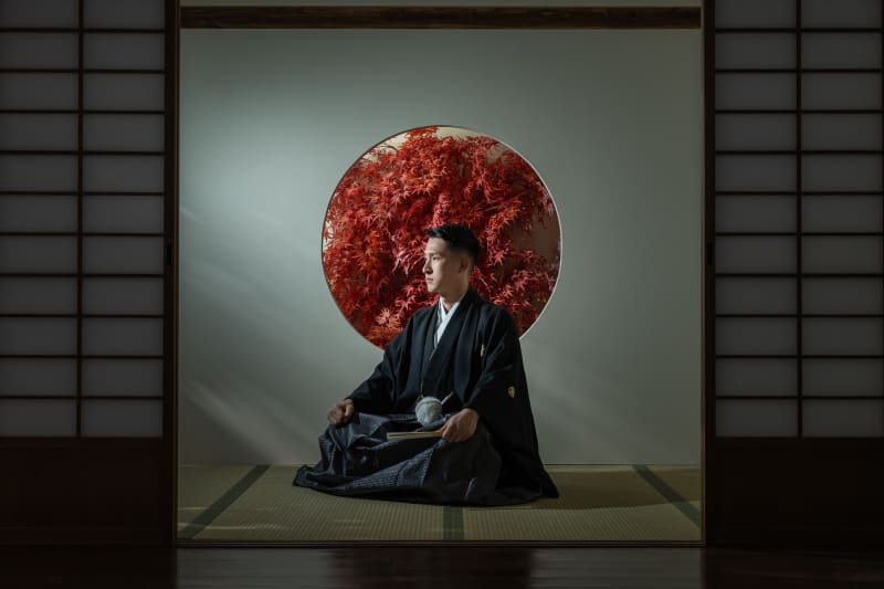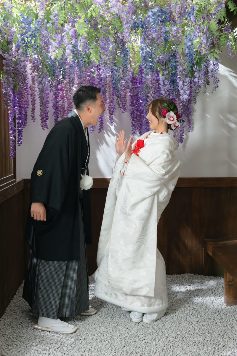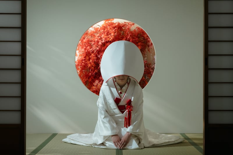 後ろの紅葉と、白無垢の差し色の紅がピッタリです!