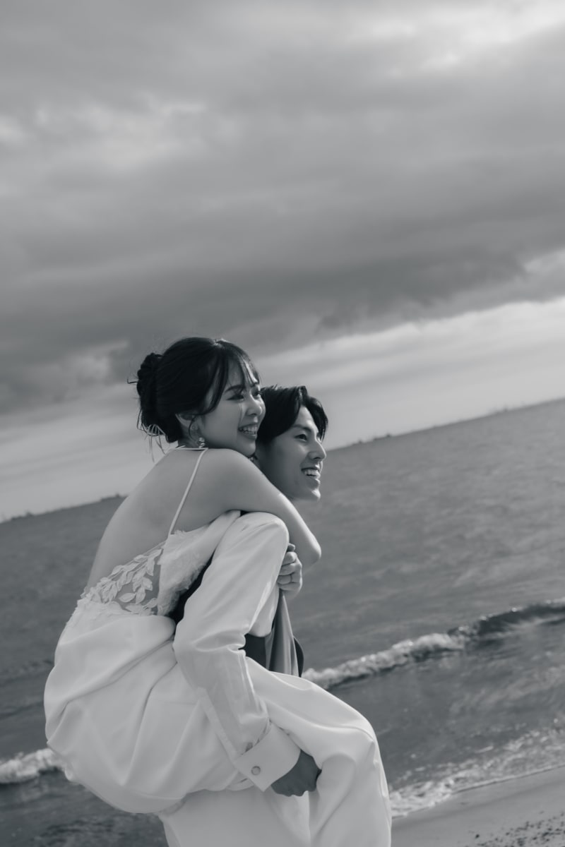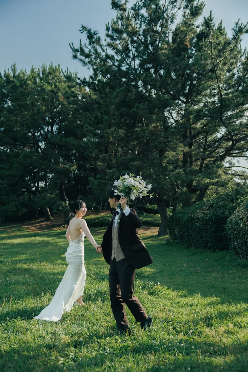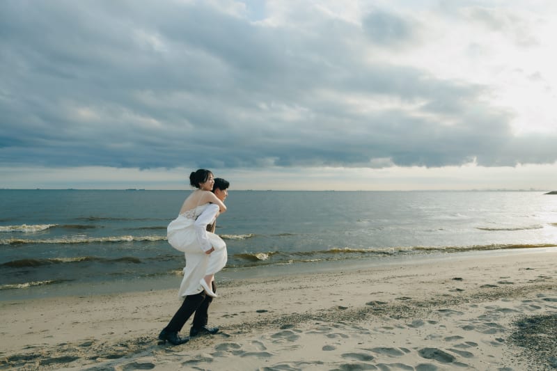 新婦さんをおんぶして太陽に向かって歩く新郎さん!