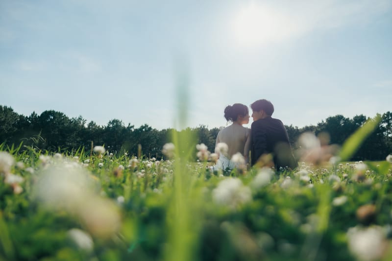稲毛海浜公園に咲いているシロツメクサに囲まれているお二人!