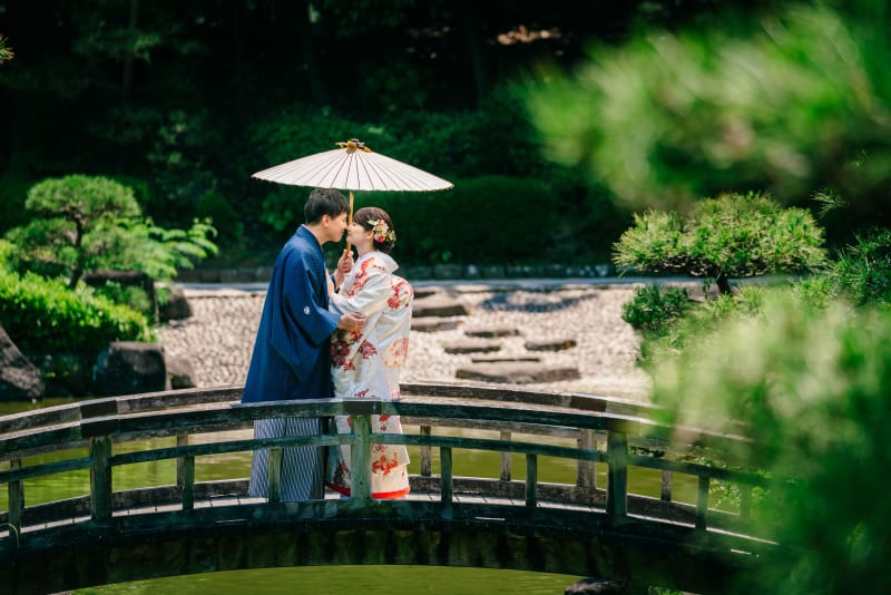 見浜園の中にある橋で。お二人にぐっと寄っていただいました。