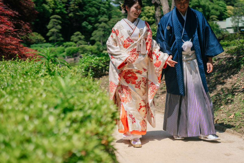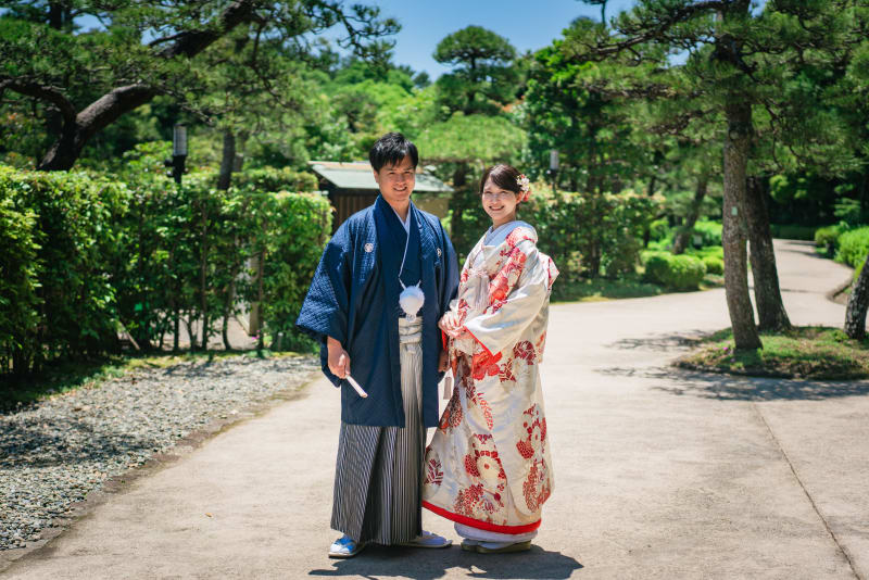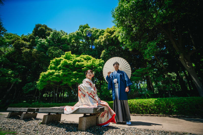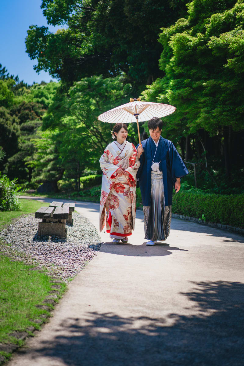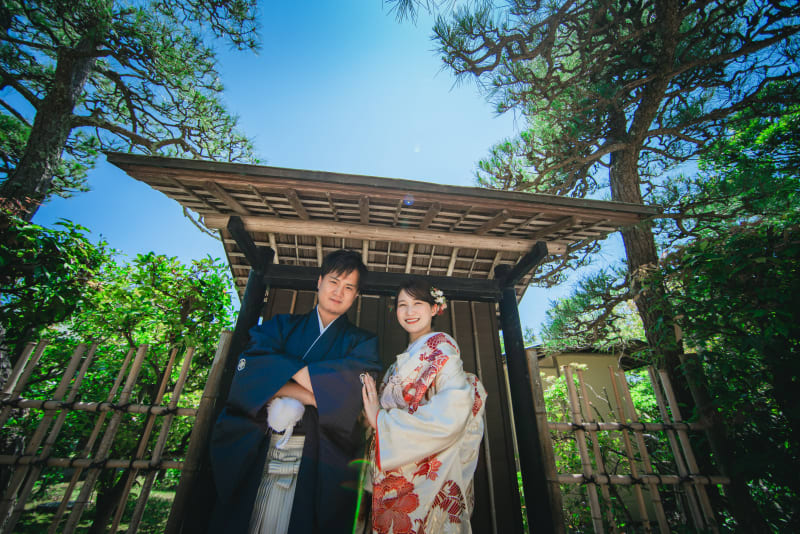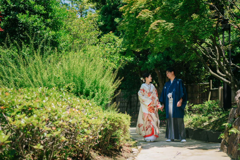 緑の中で。園内の緑はとっても美しく、秋には紅葉も美しいので、見浜園で撮影を希望のお客様はぜひご検討くださいませ!