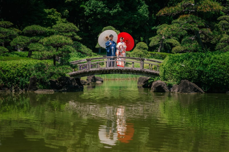 次は小さな橋で。額縁のように緑がお二人を飾ってくれています。
