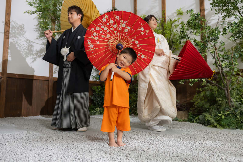 お子さんにお花を傘に見立ててお二人をお迎えに行ってもらいました!