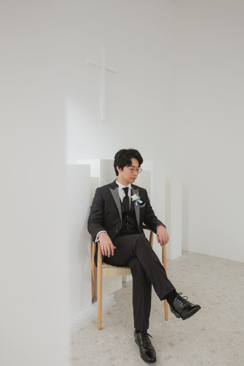 椅子に腰掛け、足を組んでクールに決めていただきました!