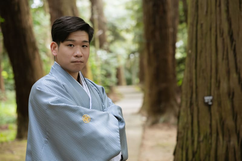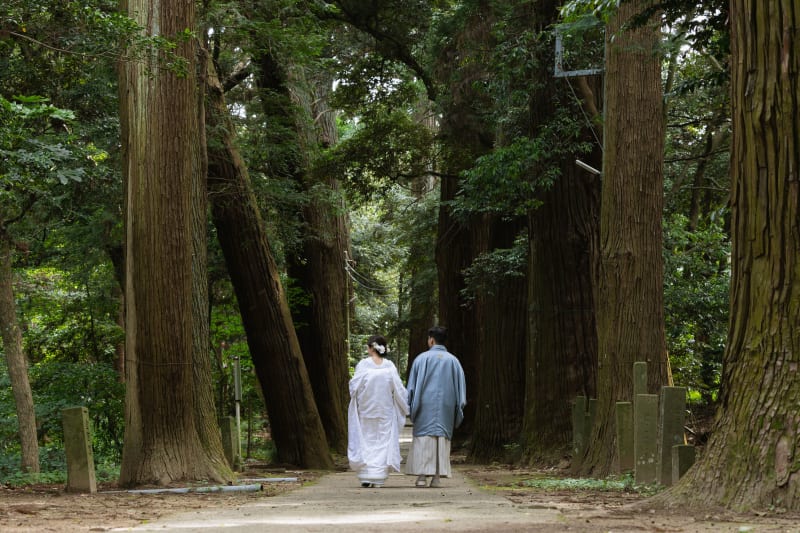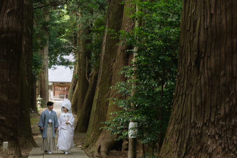 神社までの道のりには大きな樹木がそびえ立っており、木々のざわめきはまるで二人を歓迎しているかのよう。
