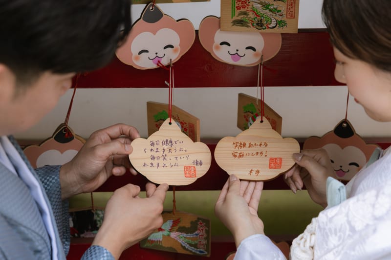 お猿さんの形の絵馬にも二人の願いや抱負を書きます。
