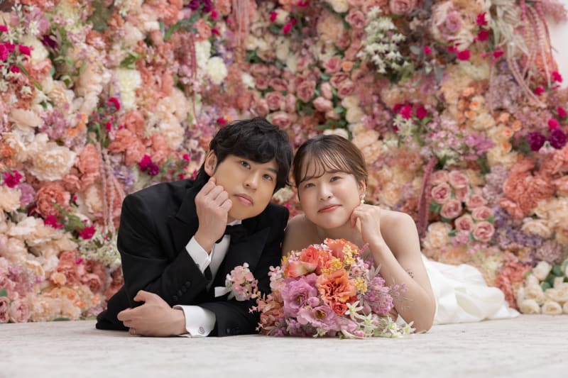 お花の壁の前で二人で寝っ転がって^^