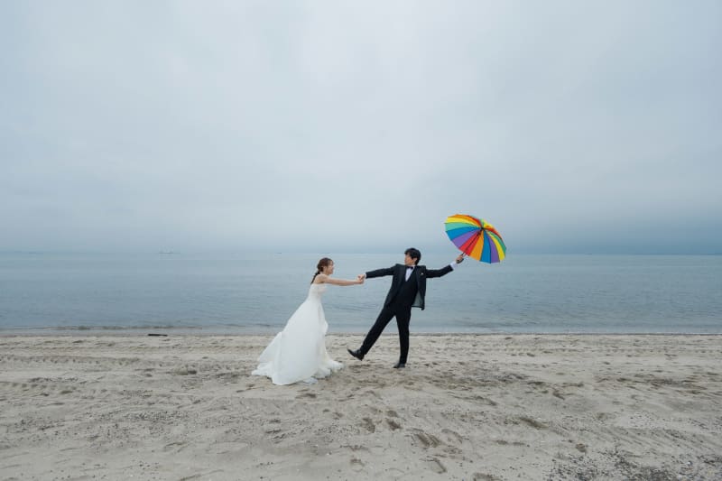 虹色の傘も海背景なのでしっかり目立ちます^^