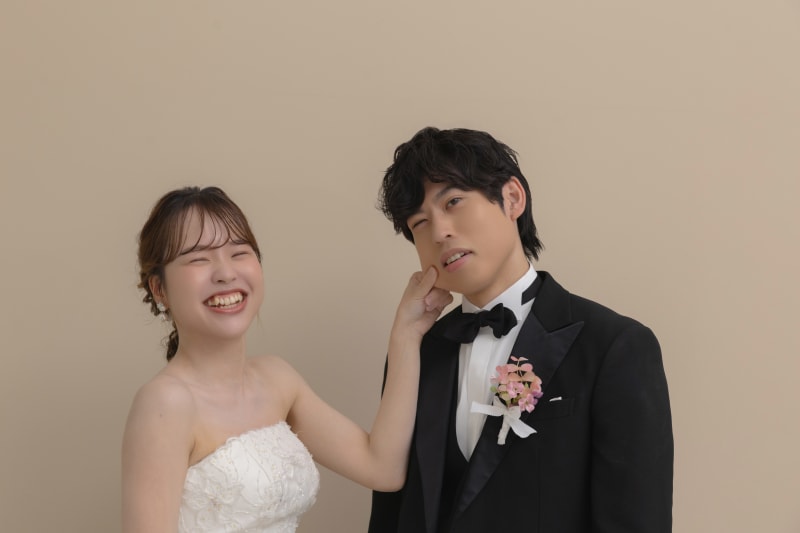新婦さん、新郎さんのほっぺをぎゅっと摘んでいる楽しそうなお写真!