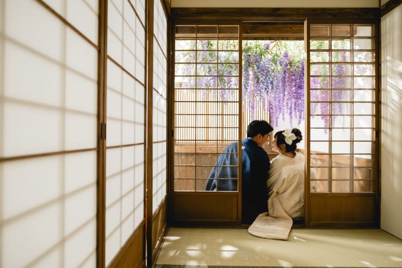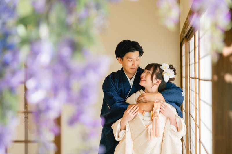 奥に見える藤の花と木漏れ日に彩られ、お二人がとっても素敵です!