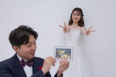 ご新郎様にご新婦様の幼少期の頃のお写真を持っていただいてご新婦様はダブルピースでパシャリ!