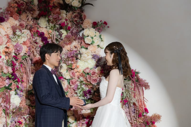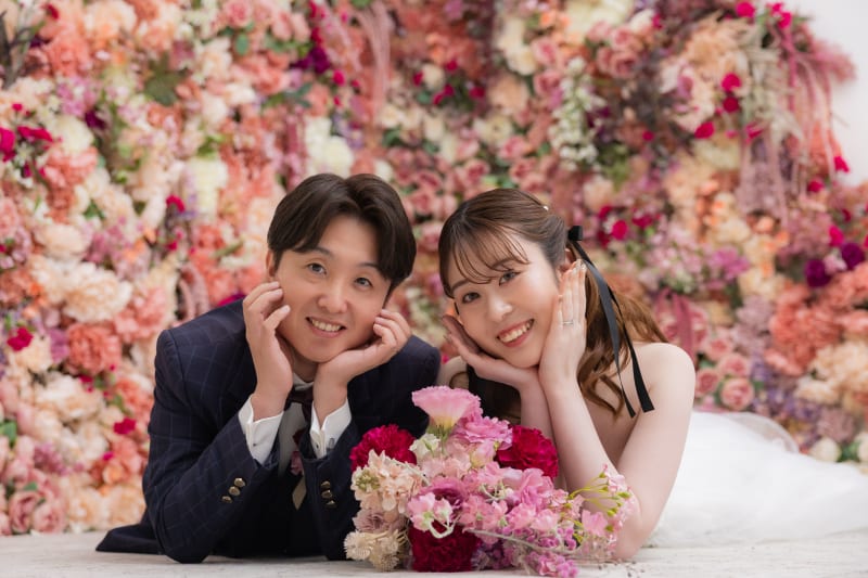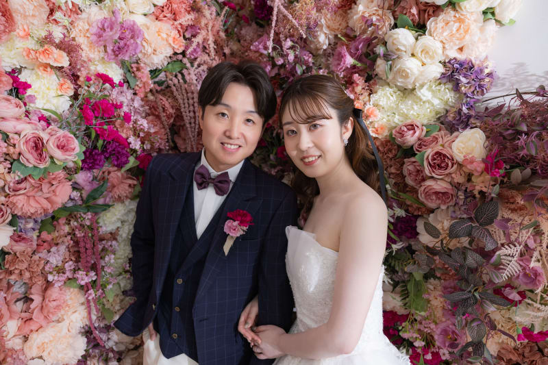 お花の壁でお二人にぎゅーっとくっついてもらいました!