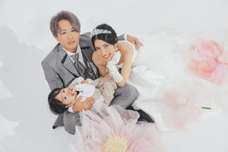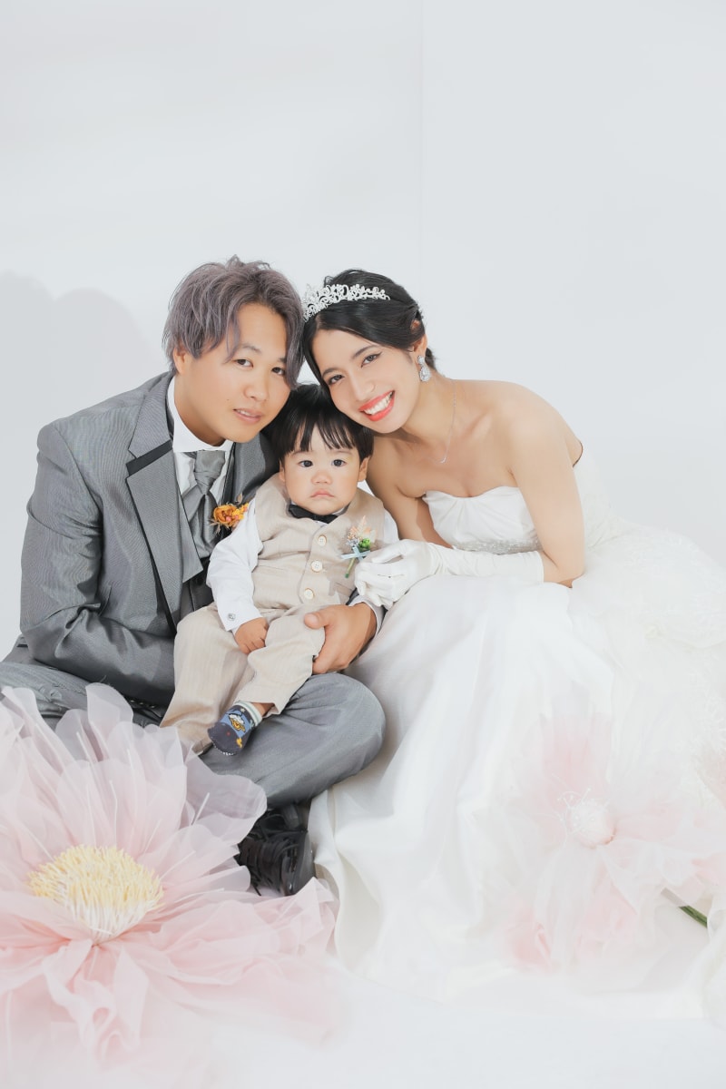 お子さんと一緒に家族写真。ジャイアントフラワーで可愛さを引き立たせます!