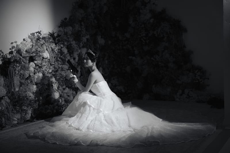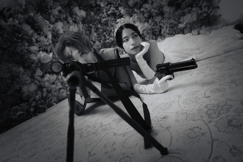 ライフルを構える新郎さんとハンドガンで周囲を警戒する新婦さんという設定ッ!