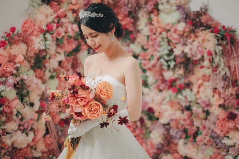 新婦さんの美しさがより引き立つように明るいお花の背景で。
