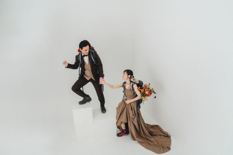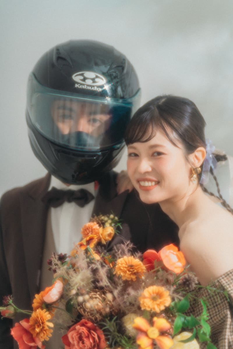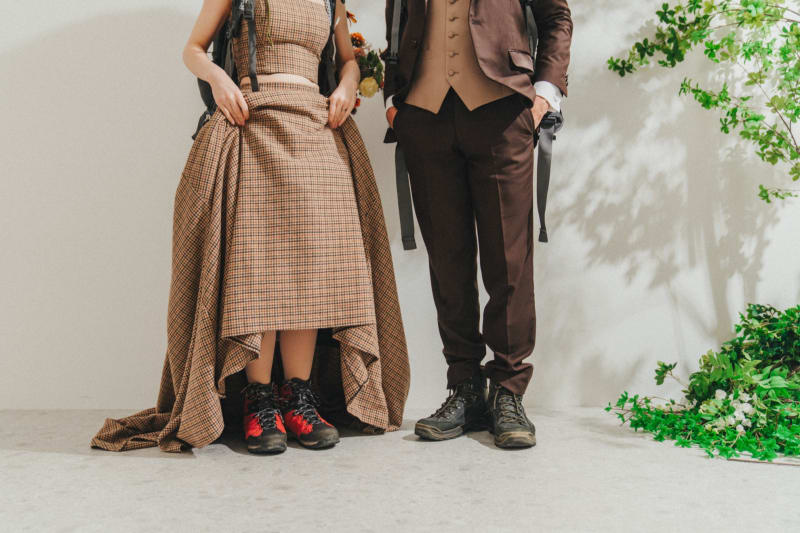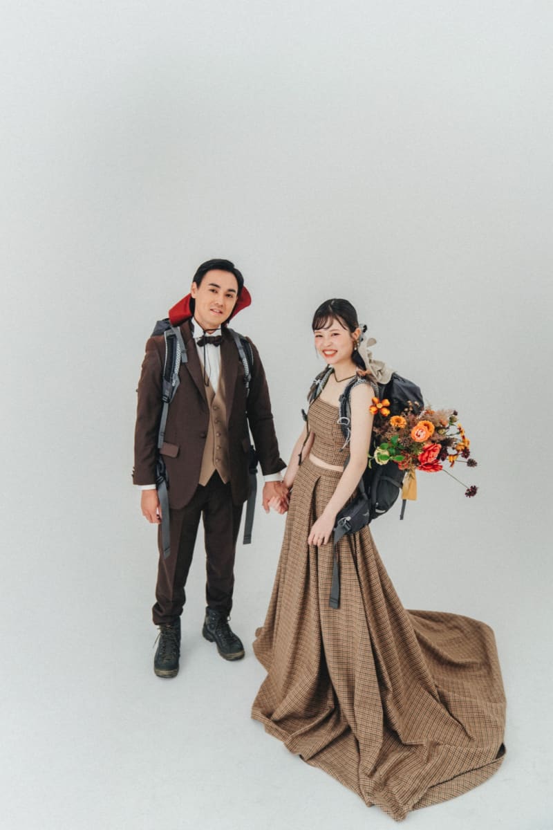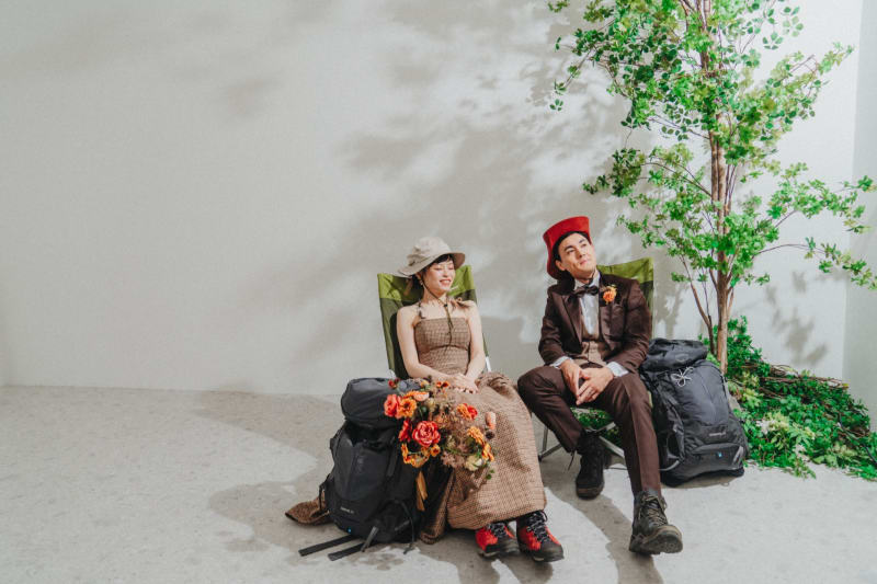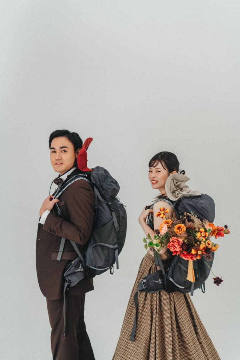 登山バックにブーケを差し込んでいるのがウェディング仕様です、笑 結婚式だとできないことも写真撮影ならできちゃいます^^