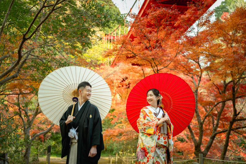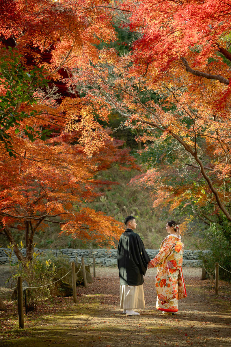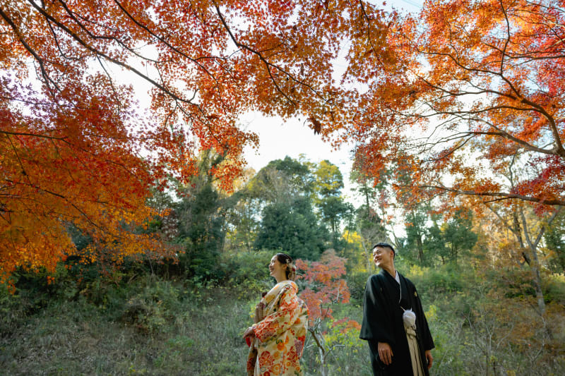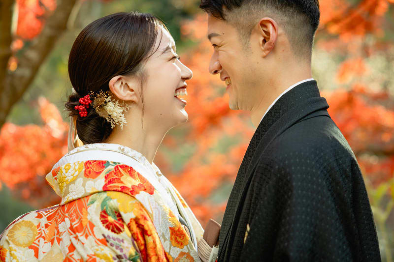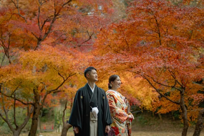 美しい紅葉がお二人を額縁のように彩ってくれています。