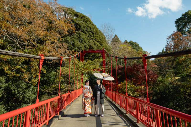 赤い橋と紅葉、そして和装の相性がバッチリです。