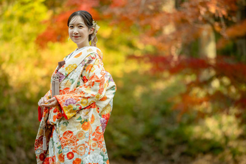 背景の紅葉と打掛の色合いが相性バッチリですね!