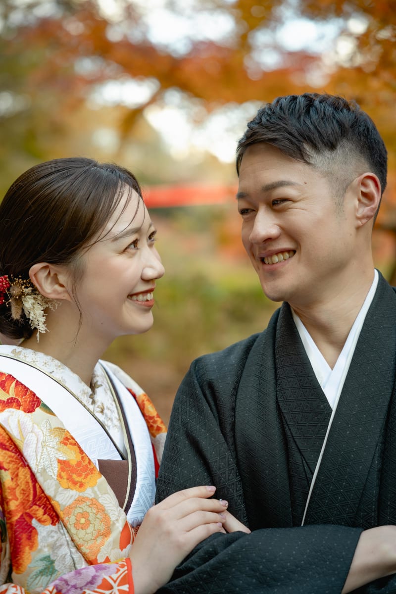 とっても笑顔が素敵なお二人に、背景の紅葉がアクセントを加えてくれていますね!