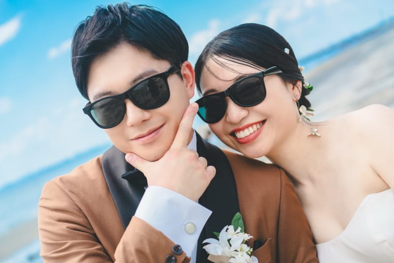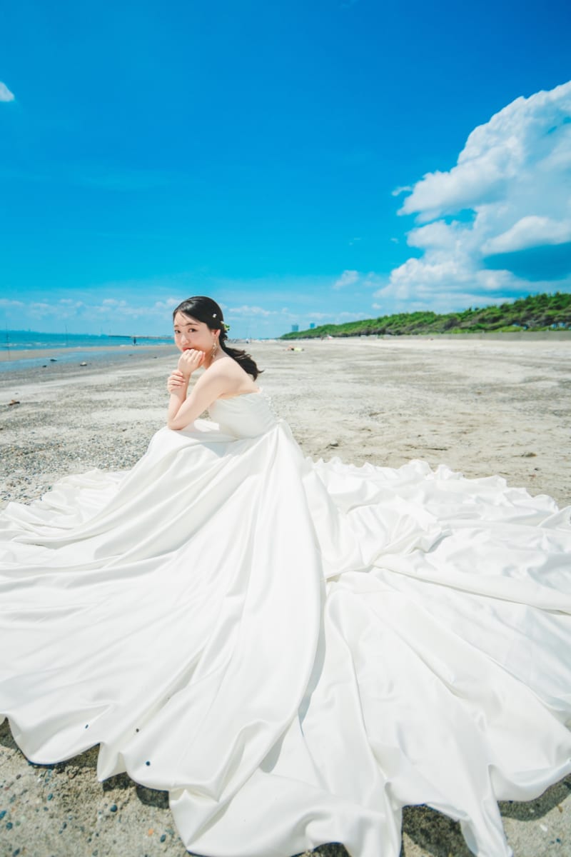 白い砂浜にドレスが映えるようにご新婦様にしゃがんで頂きました^^