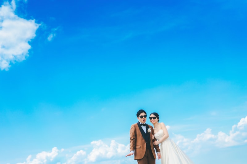 青空いっぱいのお写真! ポツンと佇む2人の様子が面白いです^^ 思いっきり引き構図の絵なので、2人にはおふざけを入れてもらいました^^