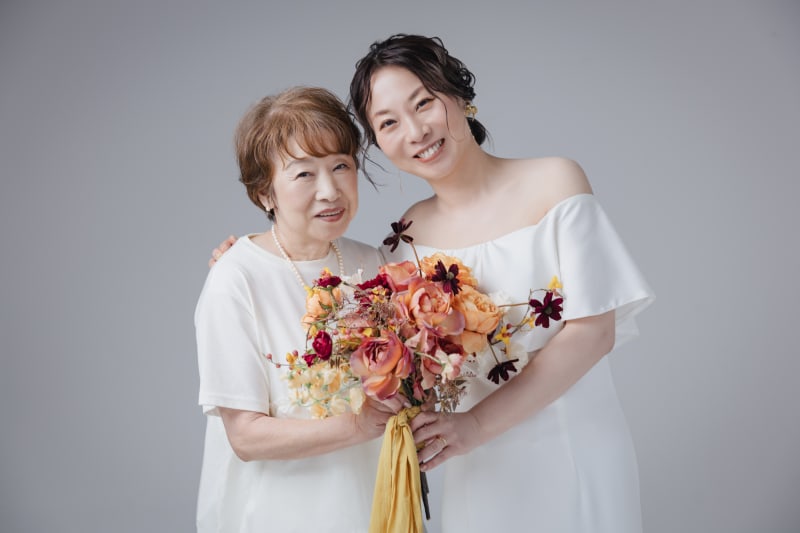 お母さんとのツーショット。ブーケも淡い色にしてくださったので写真の仕上げも淡いイメージにしました!