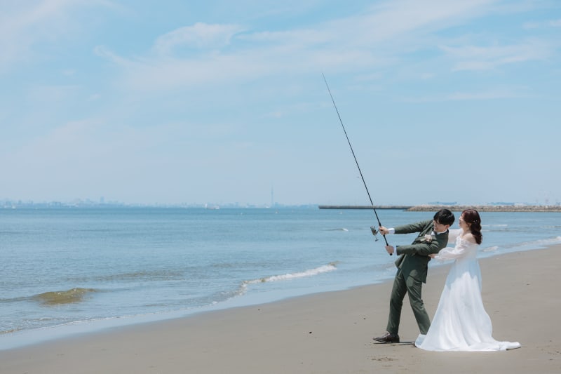 ご新郎様の趣味の釣りをしている風で!! ご新婦様にもサポートしてもらいました!!!