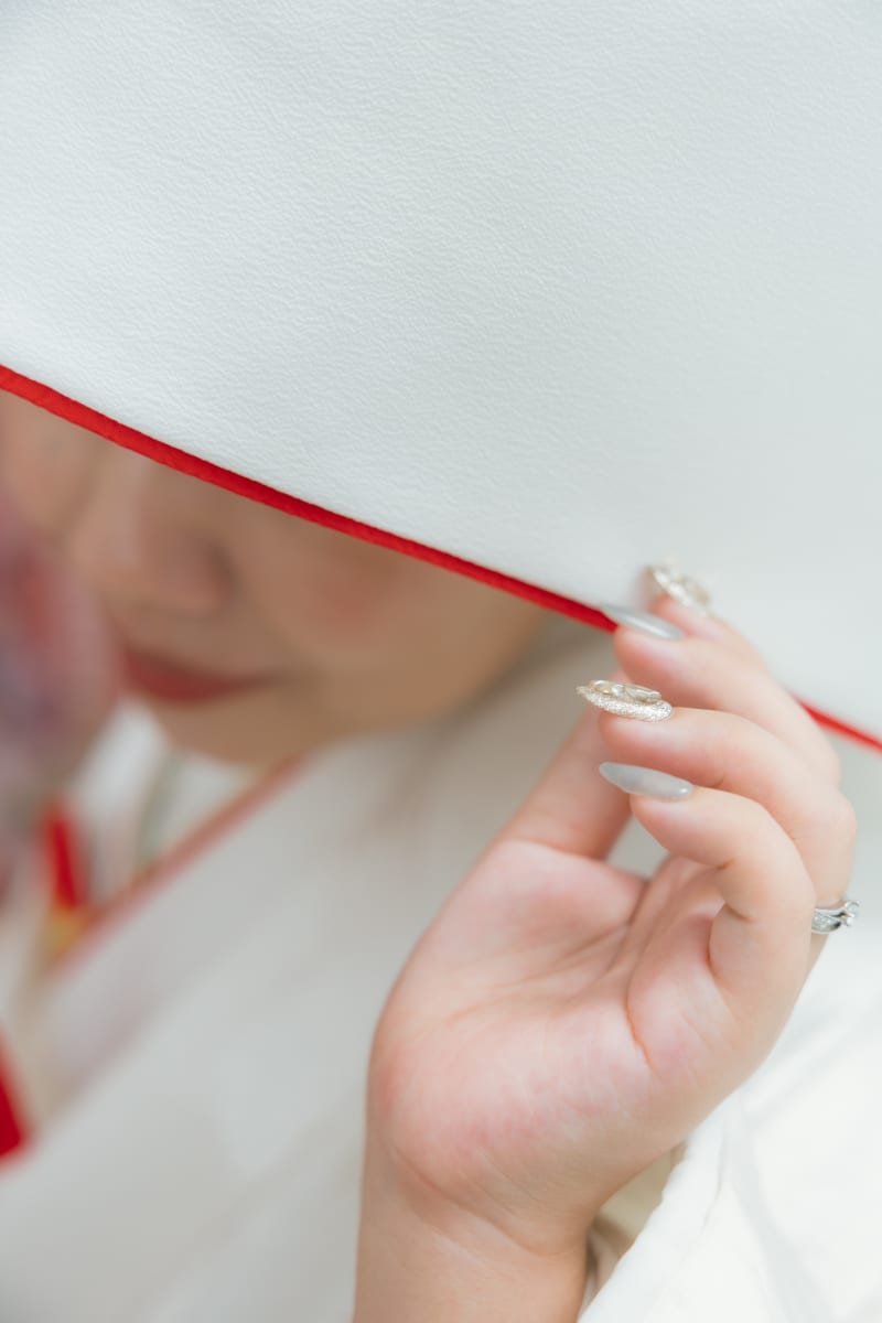 綿帽子をちょこっとつまむご新婦様のお手元。