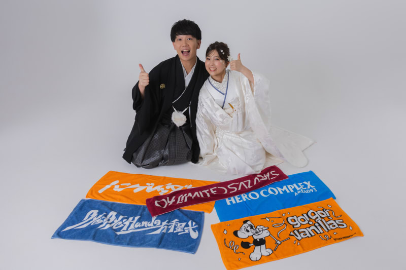 正座のお写真!!大好きなバンドのタオルを周りに添えて!!