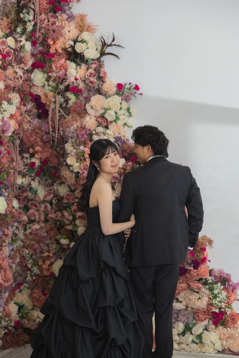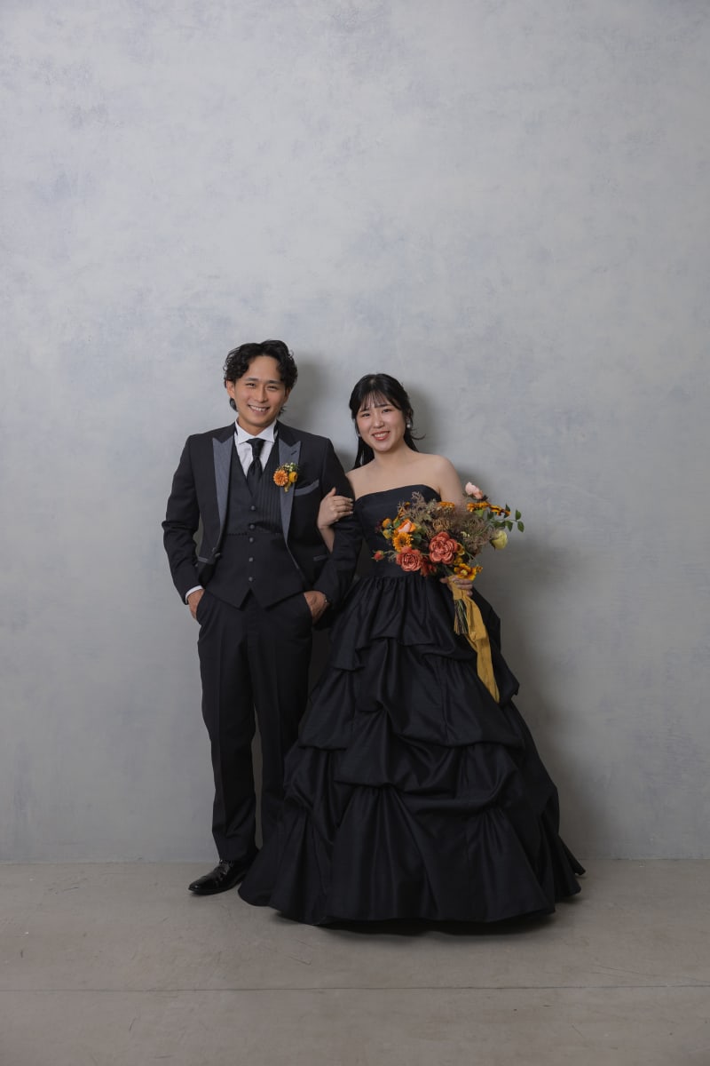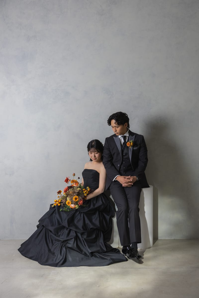 まずはピシッと真面目なポーズで。ブラックドレスにイエローやオレンジの花々がよく映えます♪