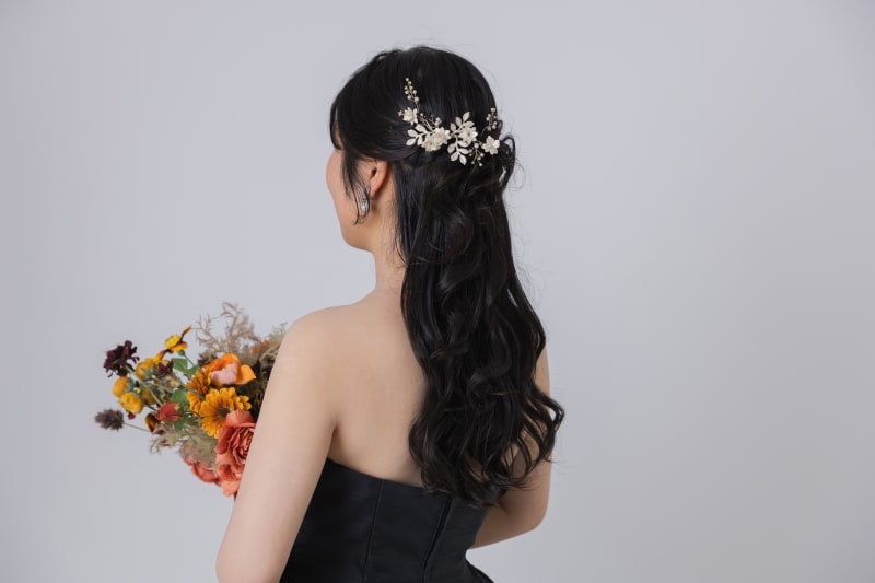 ご新婦様のヘアスタイルもしっかり撮っています!綺麗なロングヘアをくるくる巻いて、華やかな髪飾りをつけて…今日だけの特別仕様です♩