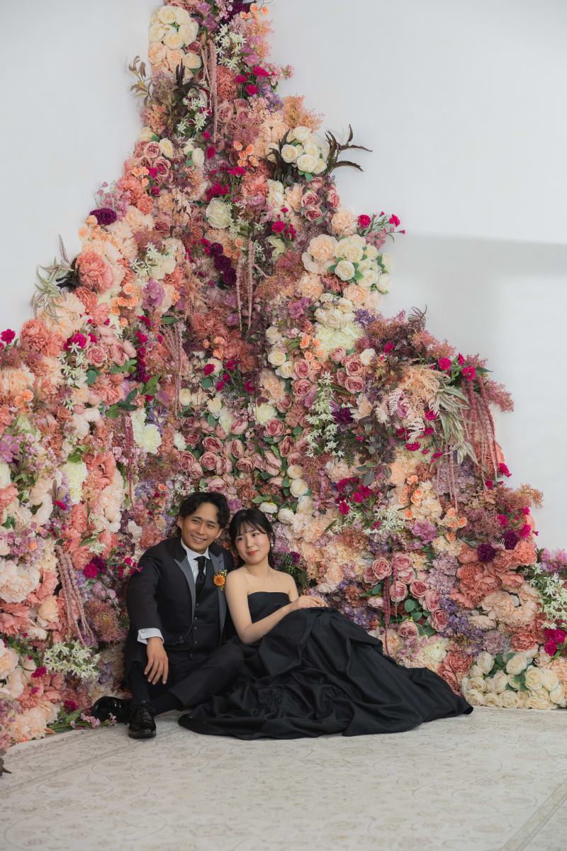 お二人で床に座って…ご新郎様に背中を預けます。華やかな花壁にも負けない存在感があるお衣装です!