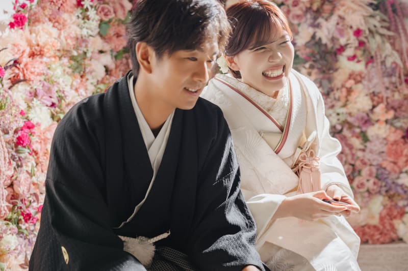 新婦さんの白無垢コーディネートのピンクを活かし、