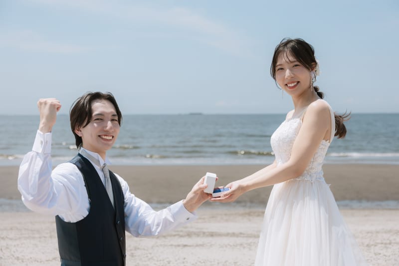 片膝で指輪の箱をパカッとする新郎さんとびっくりだけど嬉しそうな新婦さん。