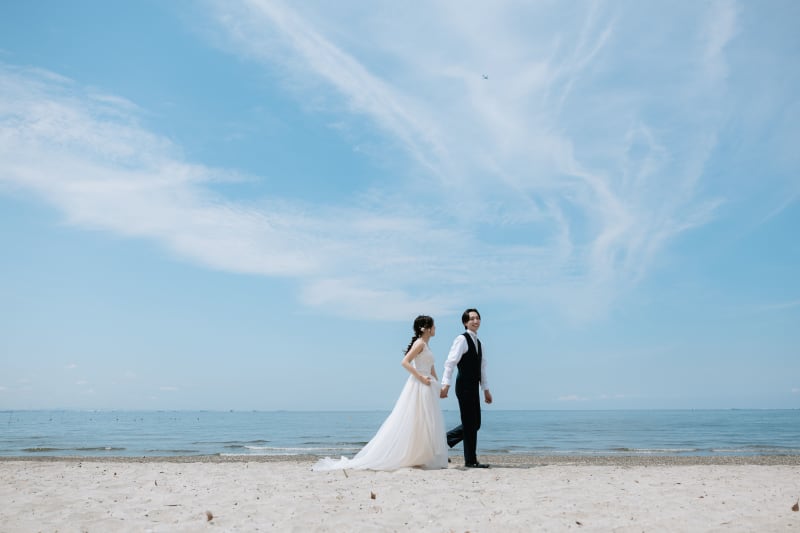 画面いっぱいに広がる青がより新婦さんの白ドレスを引き立ててくれますね。