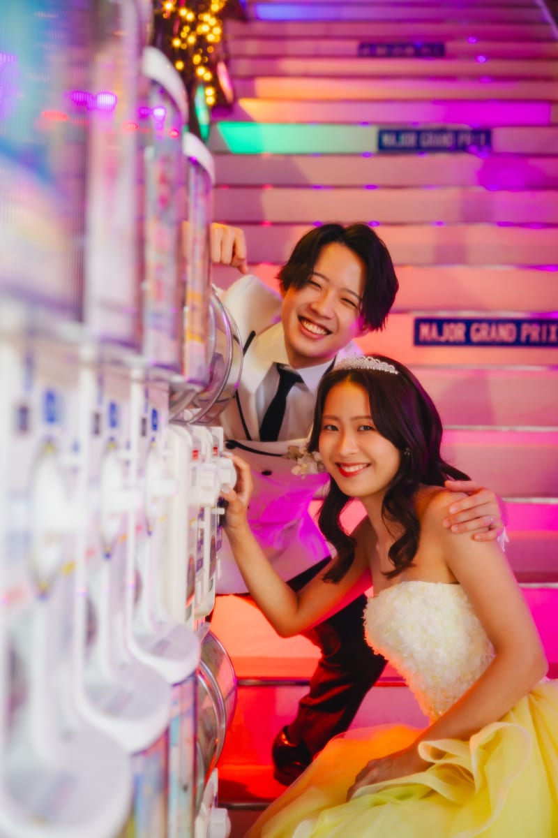 お二人の笑顔と、ネオンのピンクがとっても素敵です!