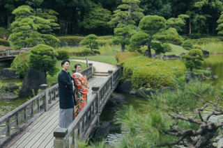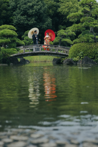 この庭園でのシンボル的な太鼓橋は、やはり和装がとっても映えますね!