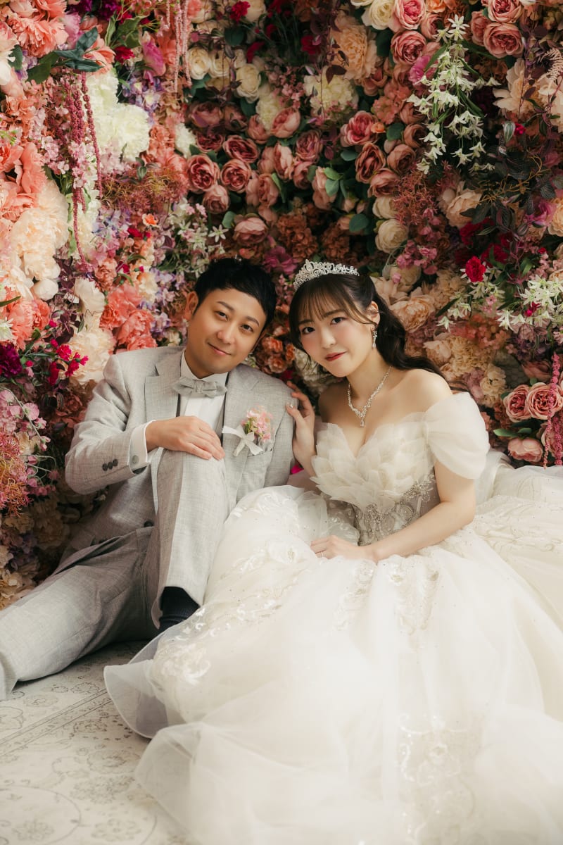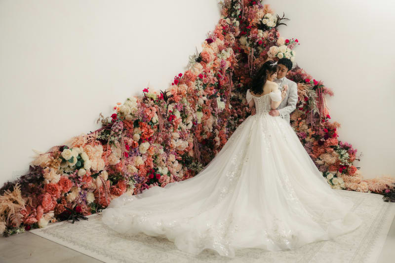 当店自慢のフラワーウォールです!ドレスをいっぱいに広げて撮影しました!
