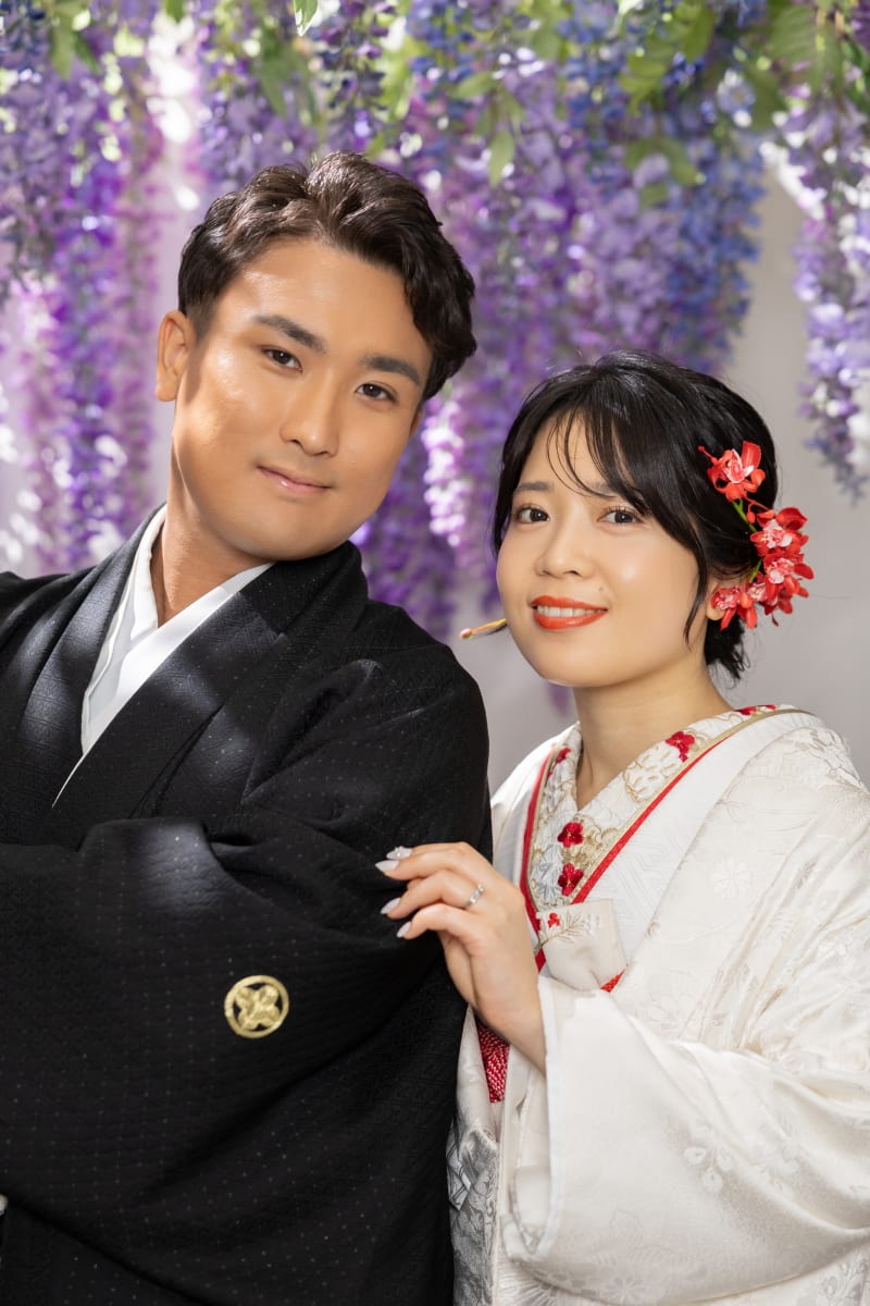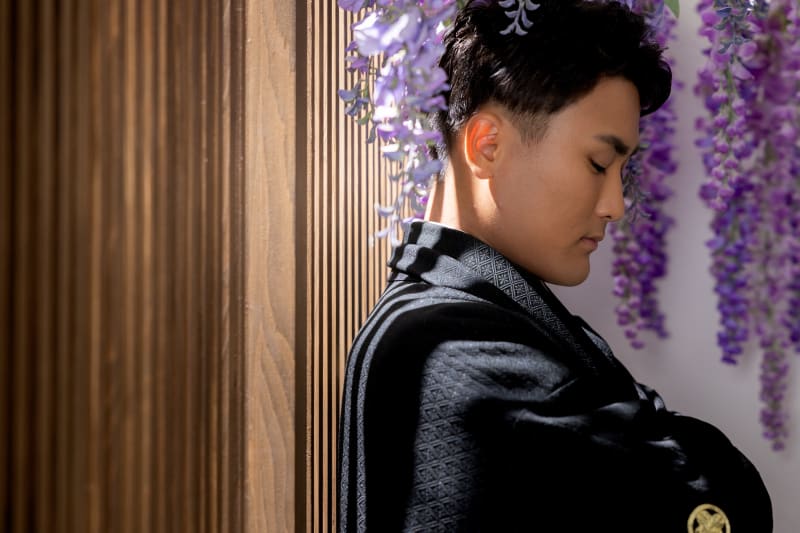 次は藤の花の下へ。ご新郎様のソロショット!