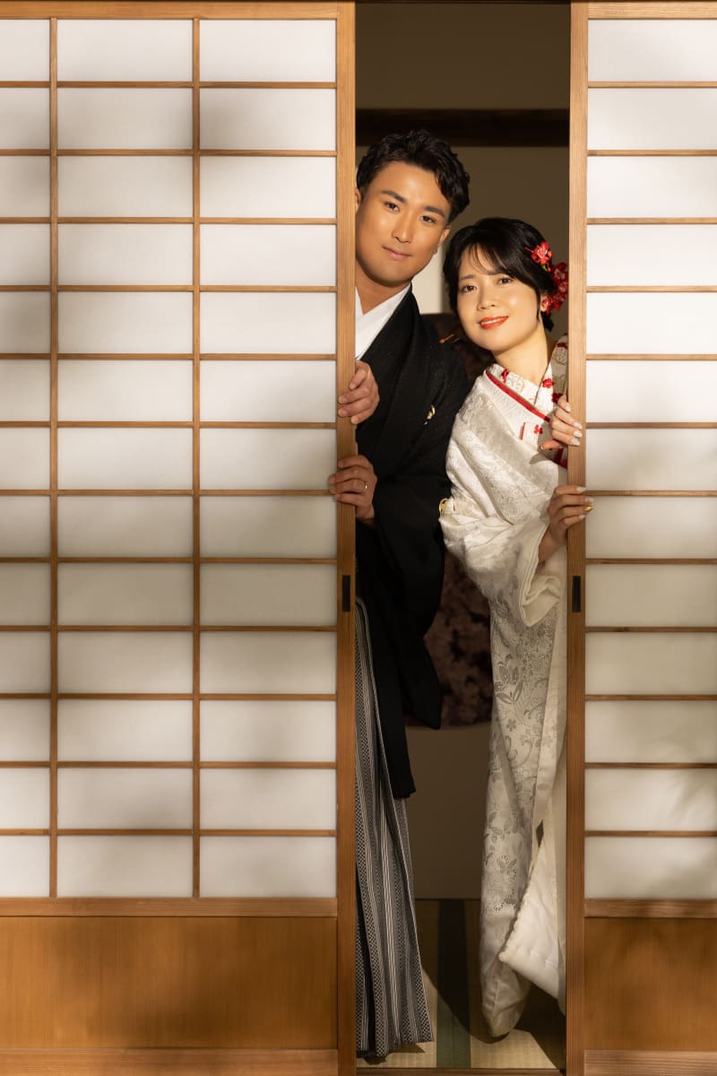 障子にちょこっと添えられた手と、こちらを覗く顔が可愛らしい一枚です♩