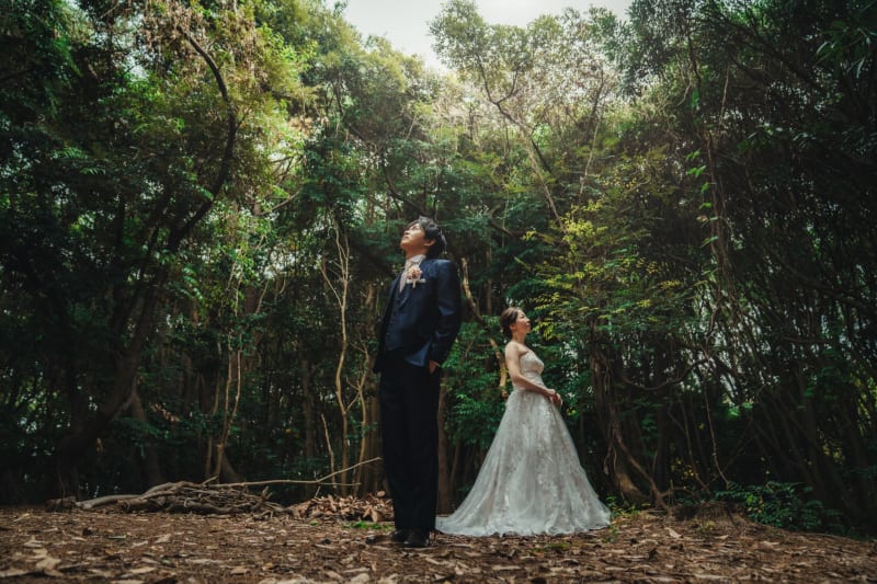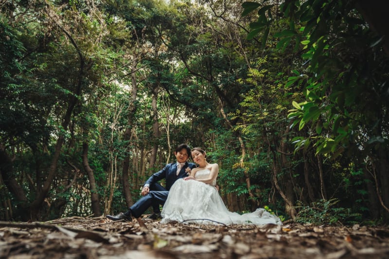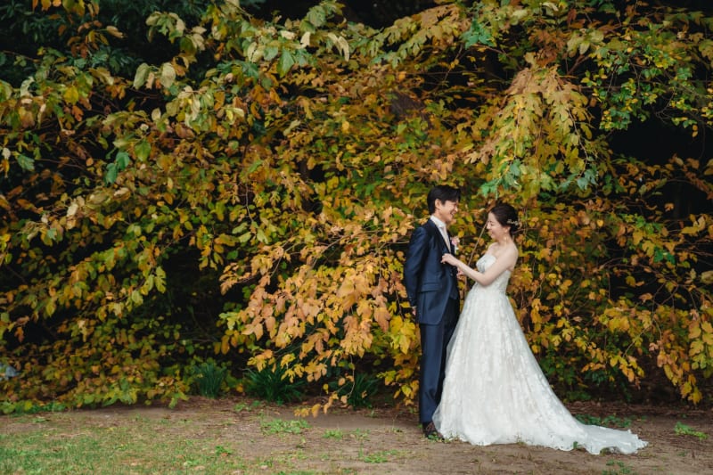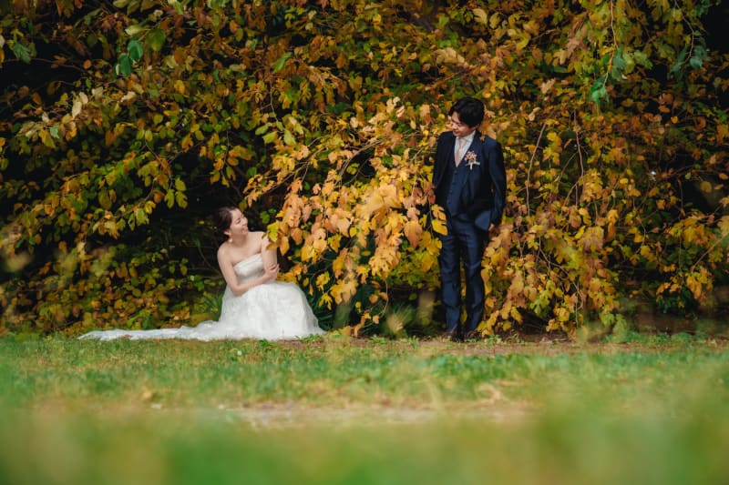 葉っぱの間から覗き込んでお互いを見つめている2人! 撮影じゃなきゃやらないことですよね笑笑