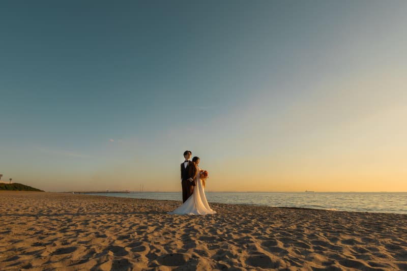 空のグラデーションと新婦さんのドレスが夕日に透けている感じとっても綺麗です!