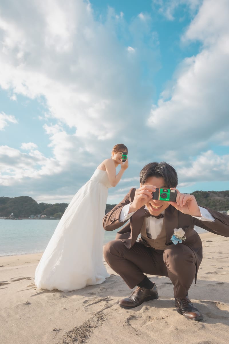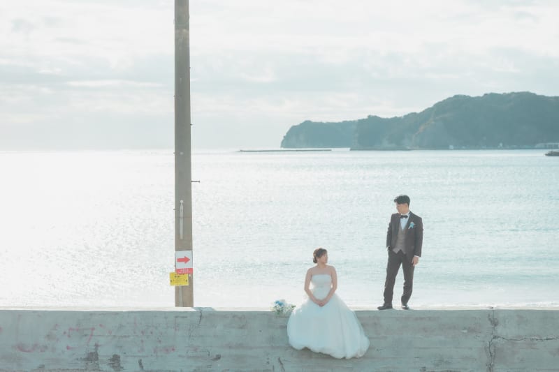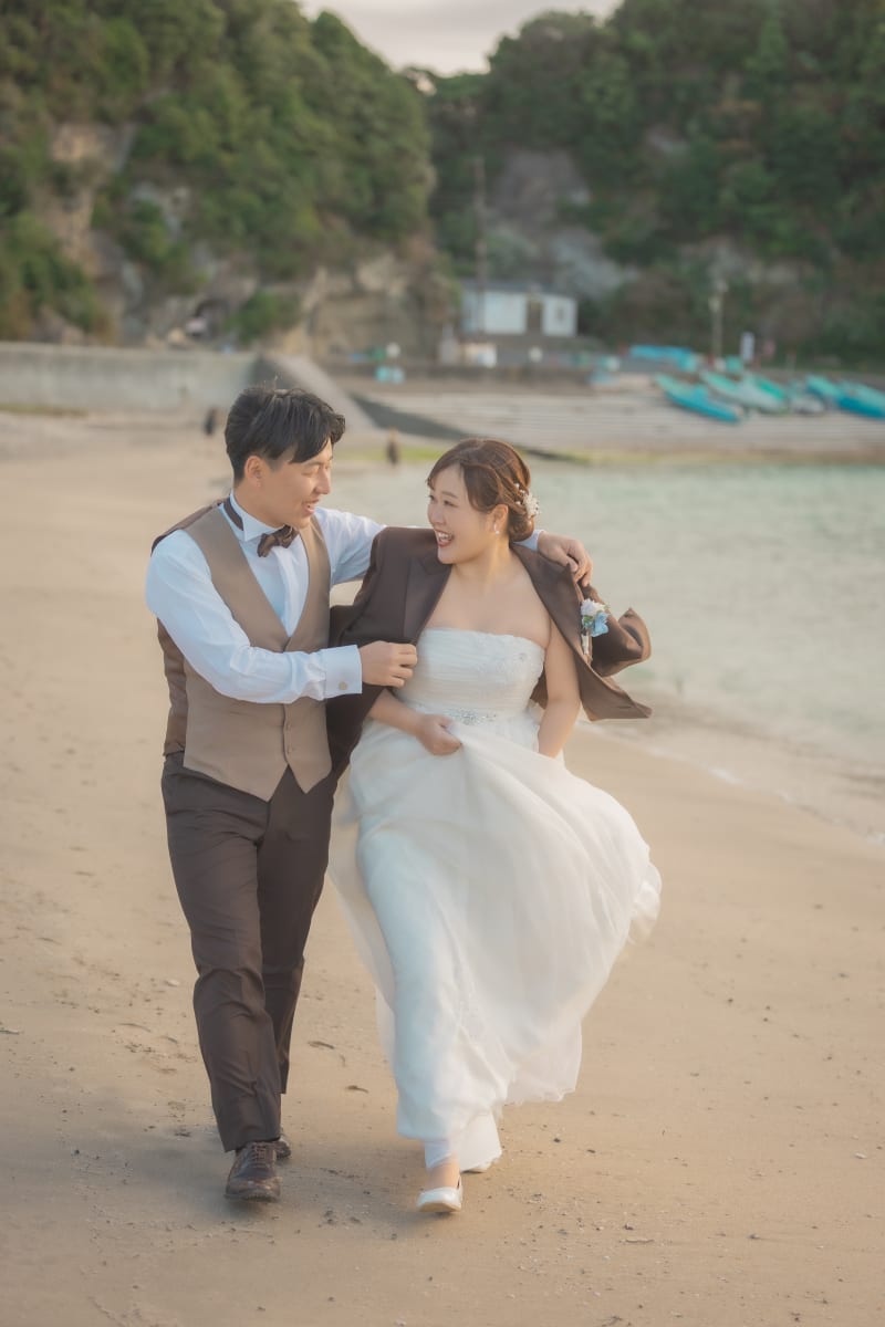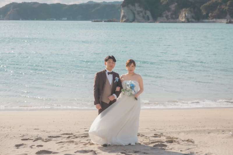 立ち姿は綺麗な海をバックに撮影しました!暖かい雰囲気が似合うお二人!