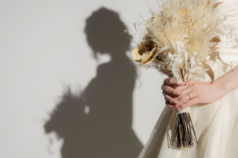 ブーケを持った手元とシルエットの影を一緒に写したおしゃれな一枚が完成しました!