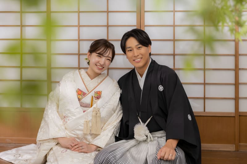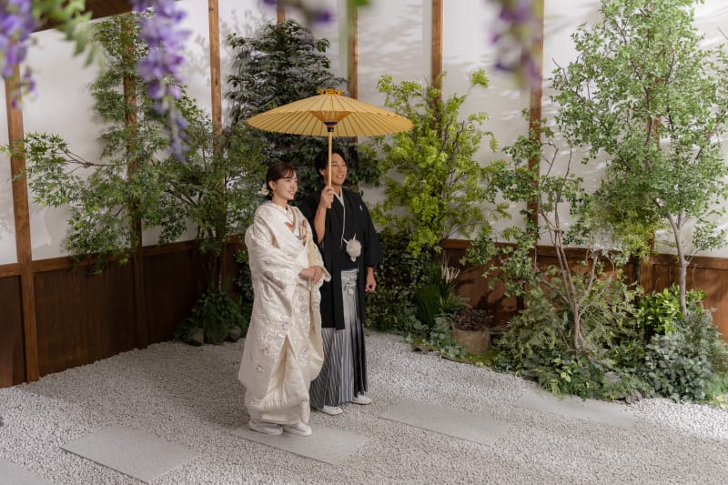 白無垢と紋付袴で、静かな和の庭に佇む一枚。