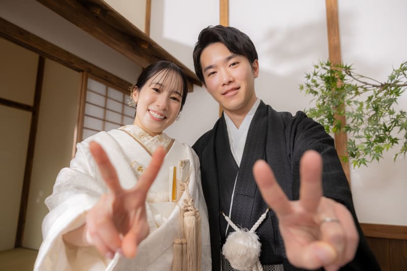 障子から差し込む柔らかな光が、白無垢を静かに照らします。
